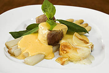 Zum Anrichten ein Stück Kartoffelgratin formschön (z.B. mit einem Ausstecher) auf den Teller geben, den Spargel daneben legen. Die Filets auf dem Spargel anrichten und die Sauce Hollandaise angießen.